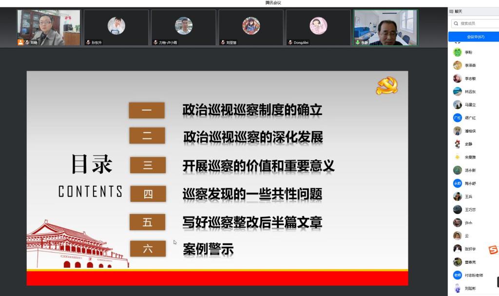 李静以《强化政治监督 履行职能责任 为落实立德树人根本任务贡献力量》为题,从巡视工作的发展历程、政治巡视制度的确立、高校开展巡察的重要意义、巡察发现的一些共性问题、写好巡察整改后半篇文章等五个方面,理论结合实践,对习近平总书记关于巡视巡察工作的新思想、新观点、新精神进行了深入解读和诠释。同时他结合自身巡察工作实际,列举了大量的巡察实例,对发现的典型案例进行剖析,不仅使大家深入理解巡察知识,也起到了警示作用。